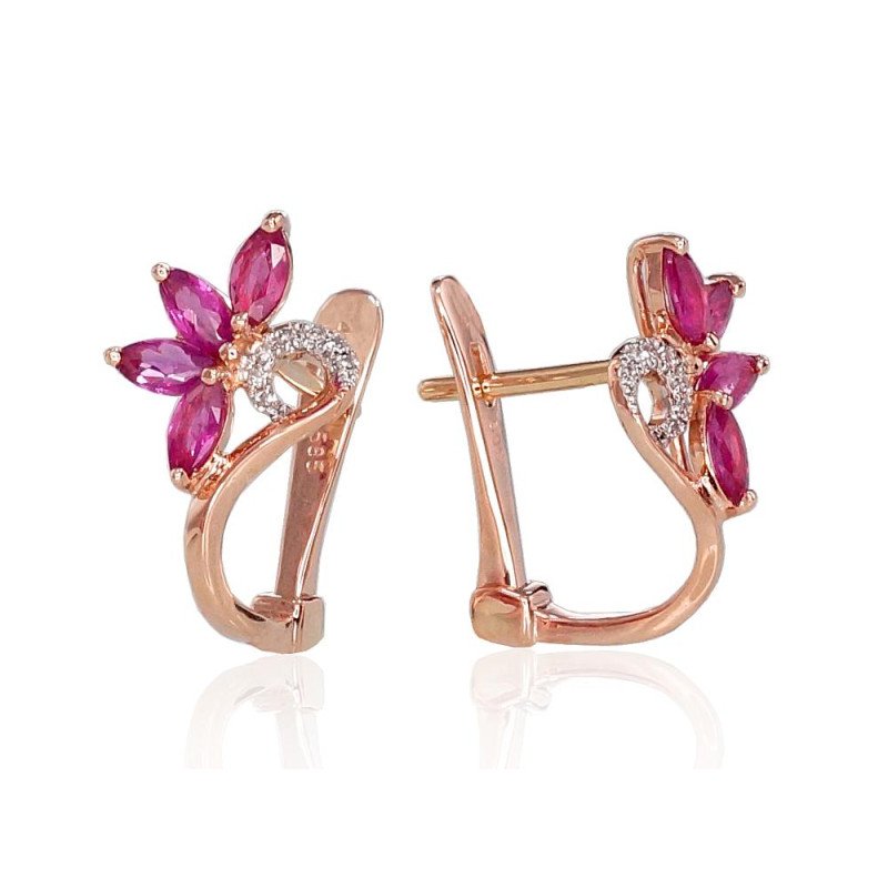 Gold earrings with 'english' lock, Red Gold 585°, Rhodium (Plating), Diamonds, Ruby