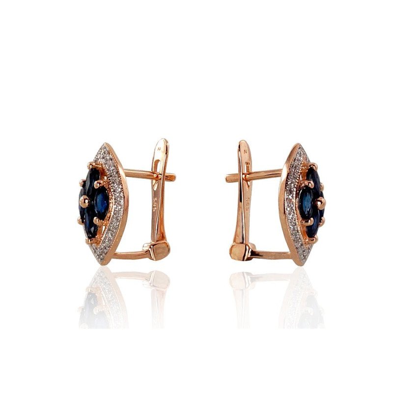 Gold earrings with 'english' lock, Red Gold 585°, Rhodium (Plating), Diamonds, Sapphire