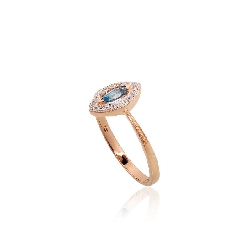 Gold ring, Red Gold 585°, Rhodium (Plating), Diamonds, Blue Topaz