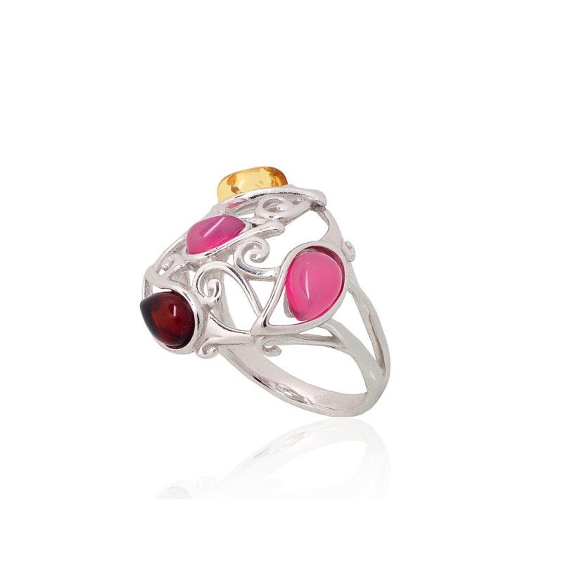 Серебряное кольцо, Серебро 925°, родий (покрытие), Аметист, Янтарь